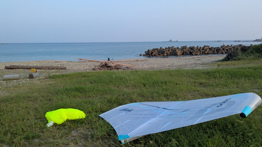 休憩後は風が落ちてしまってパラでは浮きそうにない。Fulid 1010 + 5m2の最大セットで出て、玉の浦まで登ったりしながら17時まで楽しめました